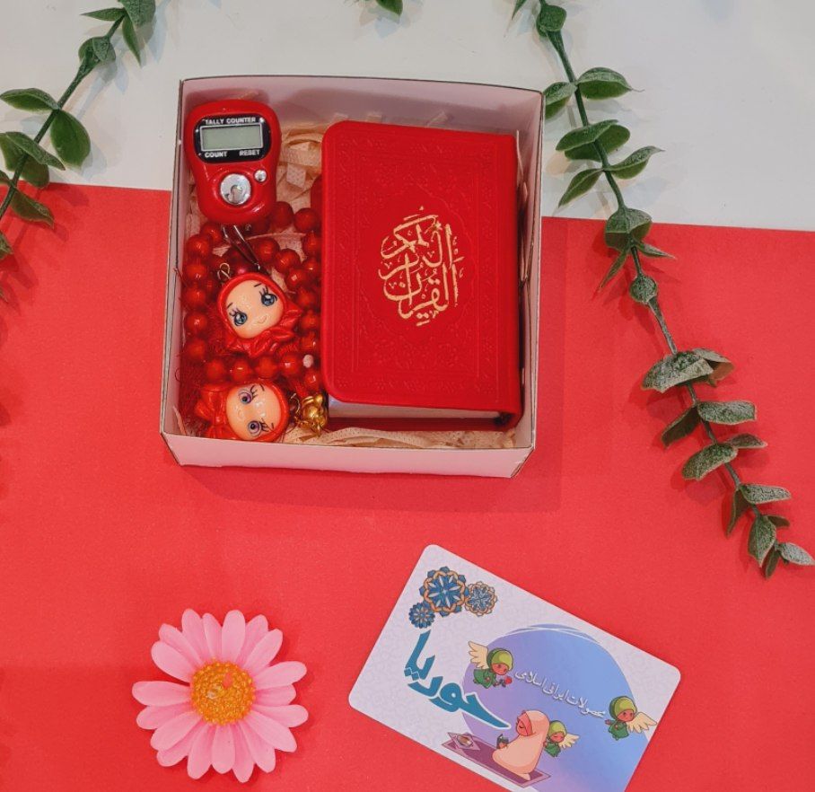 مینی پک،شامل: هدیه قرآن ۸در۸، تسبیح،نشانگر،عروسک،صلوات شمار، جامهری ۸در۸، جعبه درب طلقی