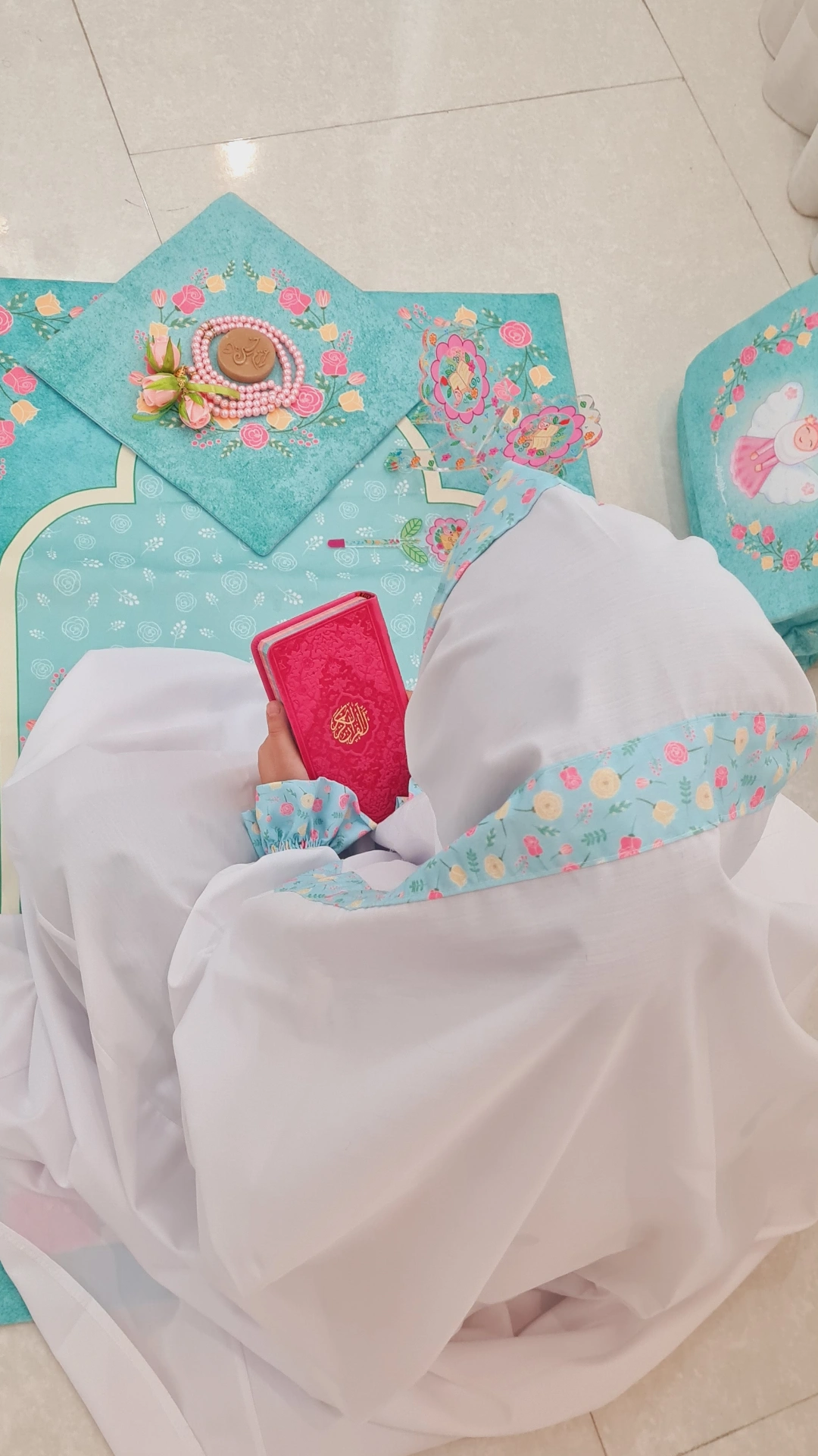 ست جشن تکلیف 🌸 رنگ سبزابی، جنس مخمل درجه یک با طرحی زیبا آسترداره.. 👛کیف بابند قابل تنظیم قابل شستشو و رنگ ثابت ابعاد سجاده 60در90.. این ست شامل سجاده، جانماز،کیف، چادر هست.. آماده سازی ده روز کاری