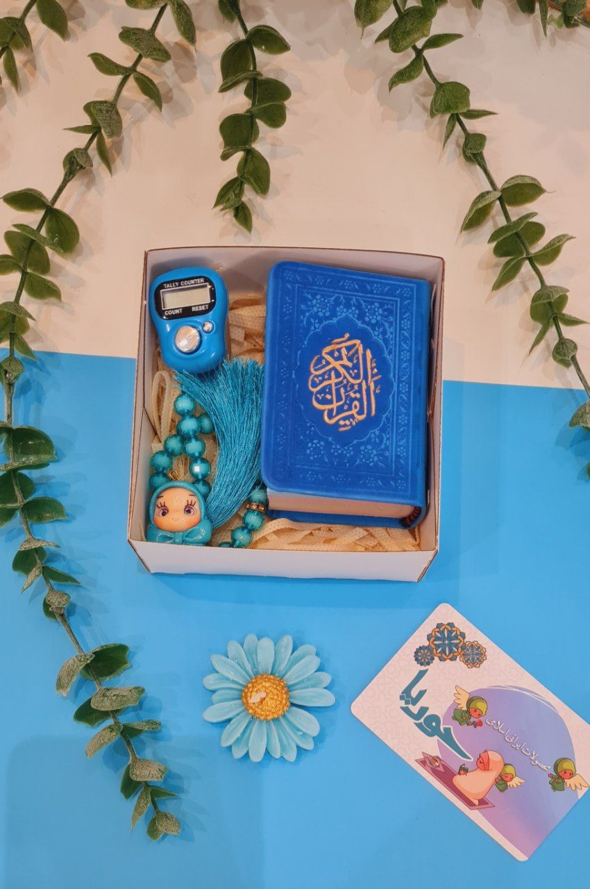 مینی پک،شامل: هدیه قرآن ۸در۸، تسبیح،گیره روسری،صلوات شمار، جعبه درب طلقی